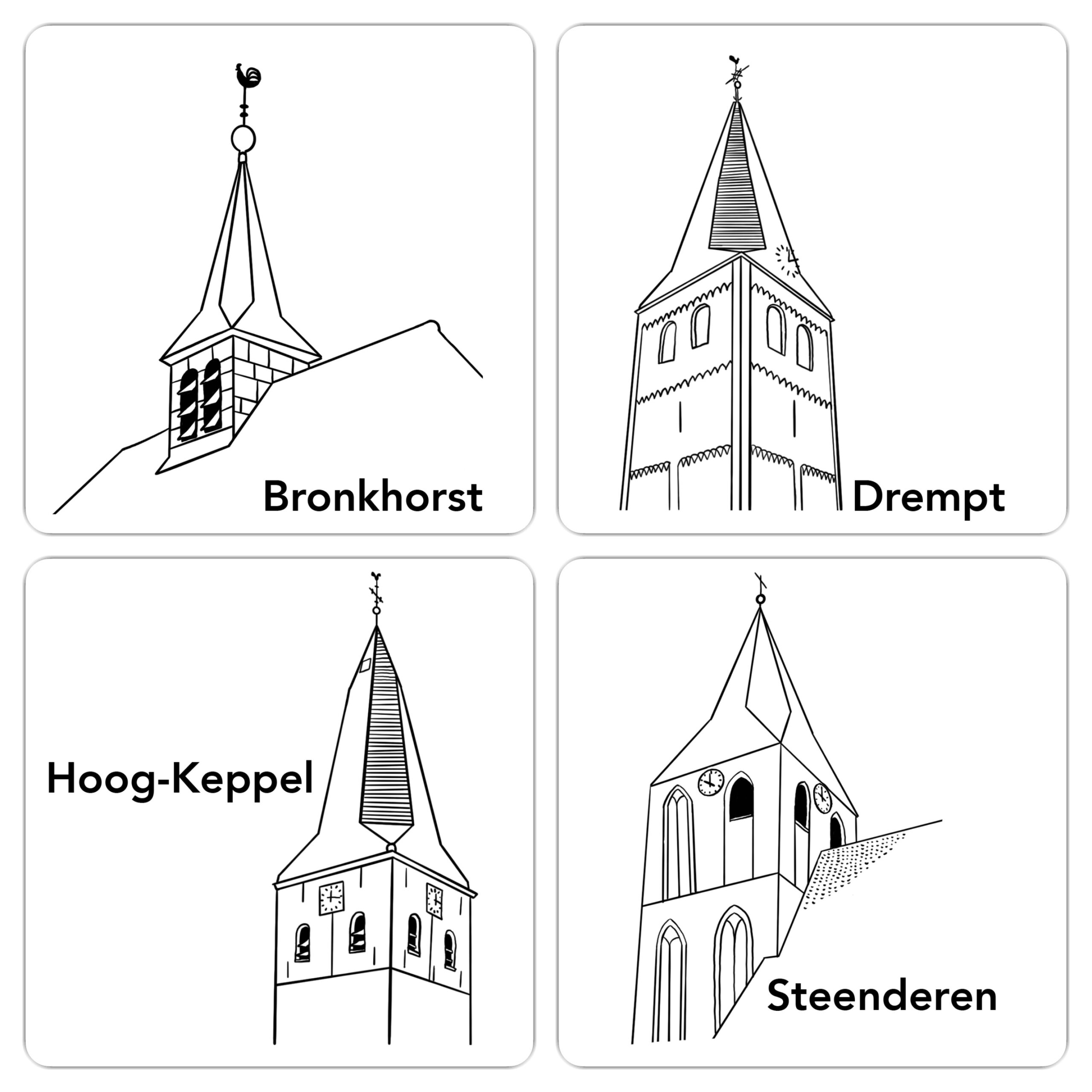 Tijdens de Achterhoekse Torentocht kun je wandelen of fietsen langs vier Gelderse Kerken: de Kapel in Bronkhorst, de Sint-Joriskerk in Drempt, de Dorpskerk in Hoog-Keppel en de Remigiuskerk in Steenderen.