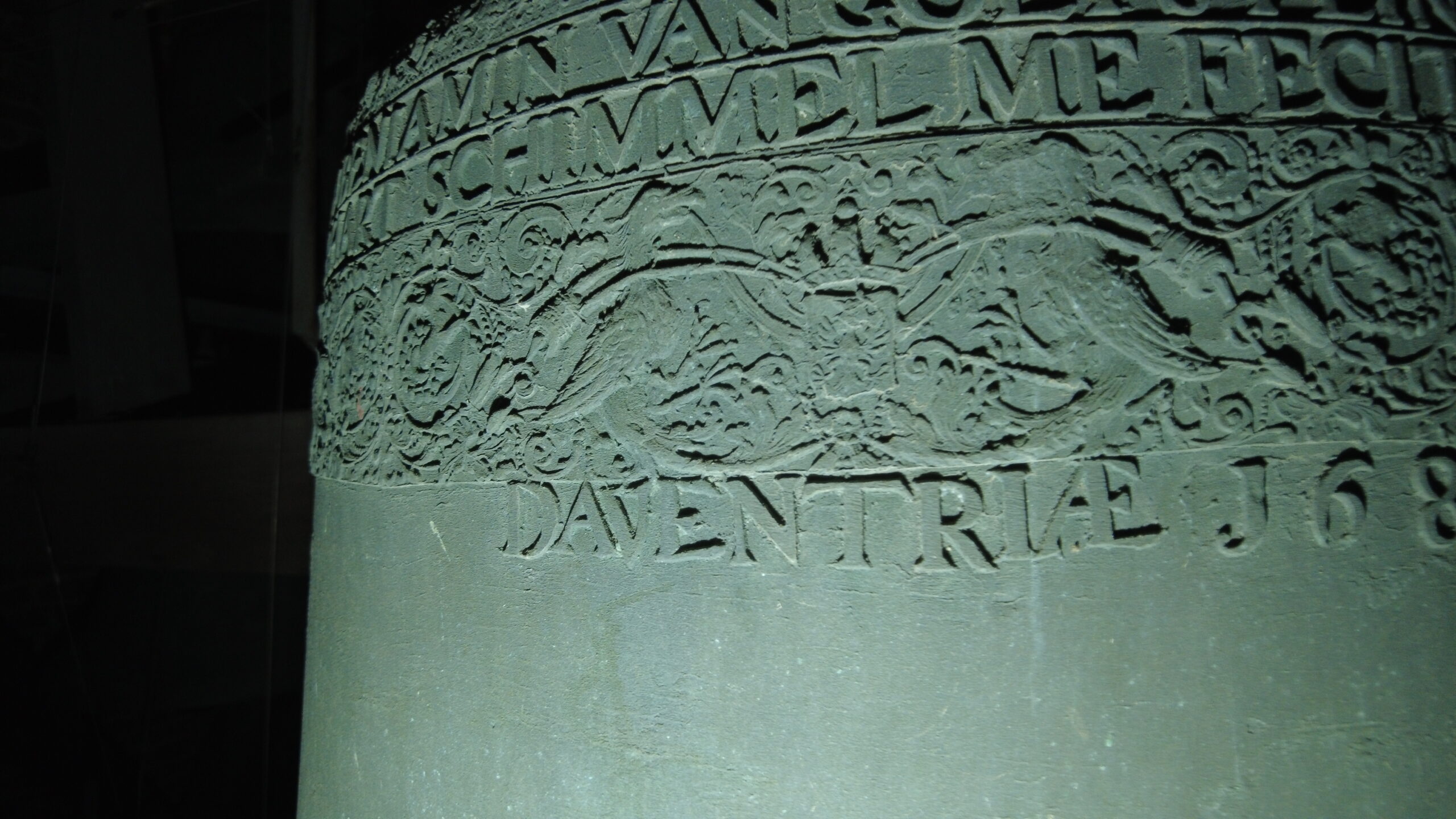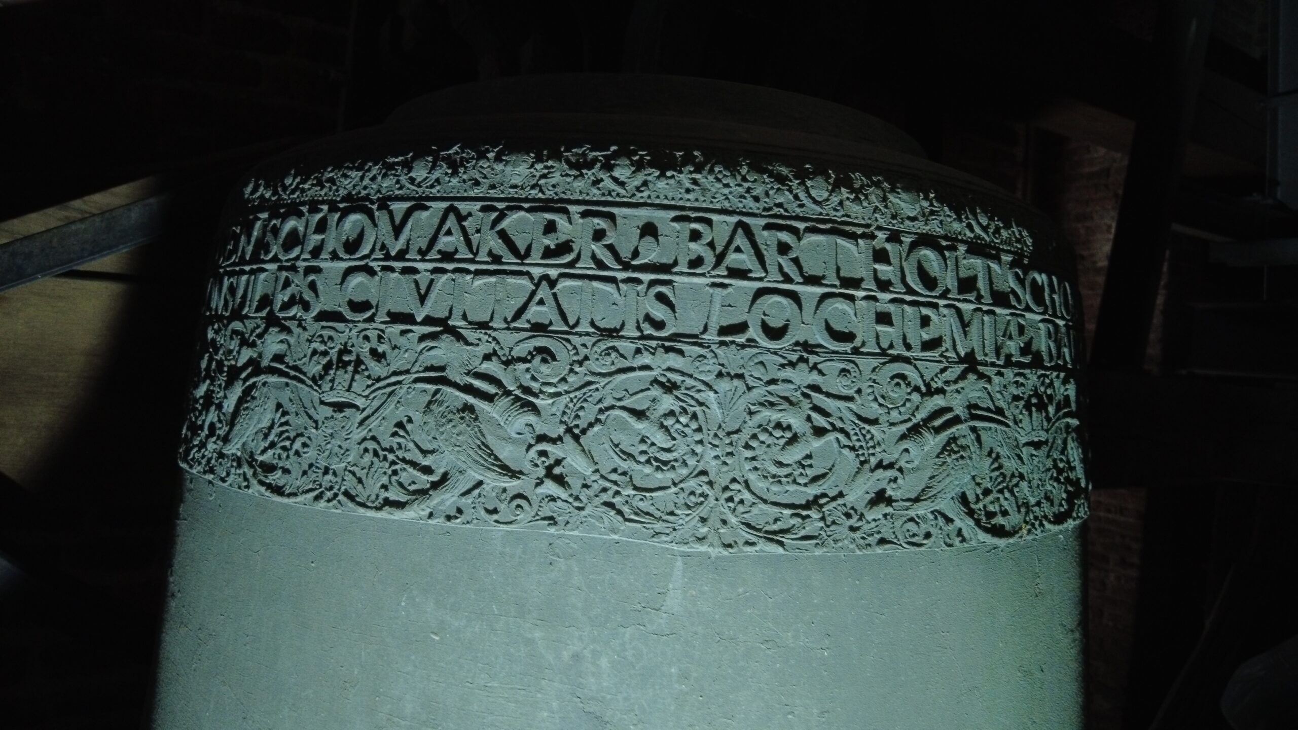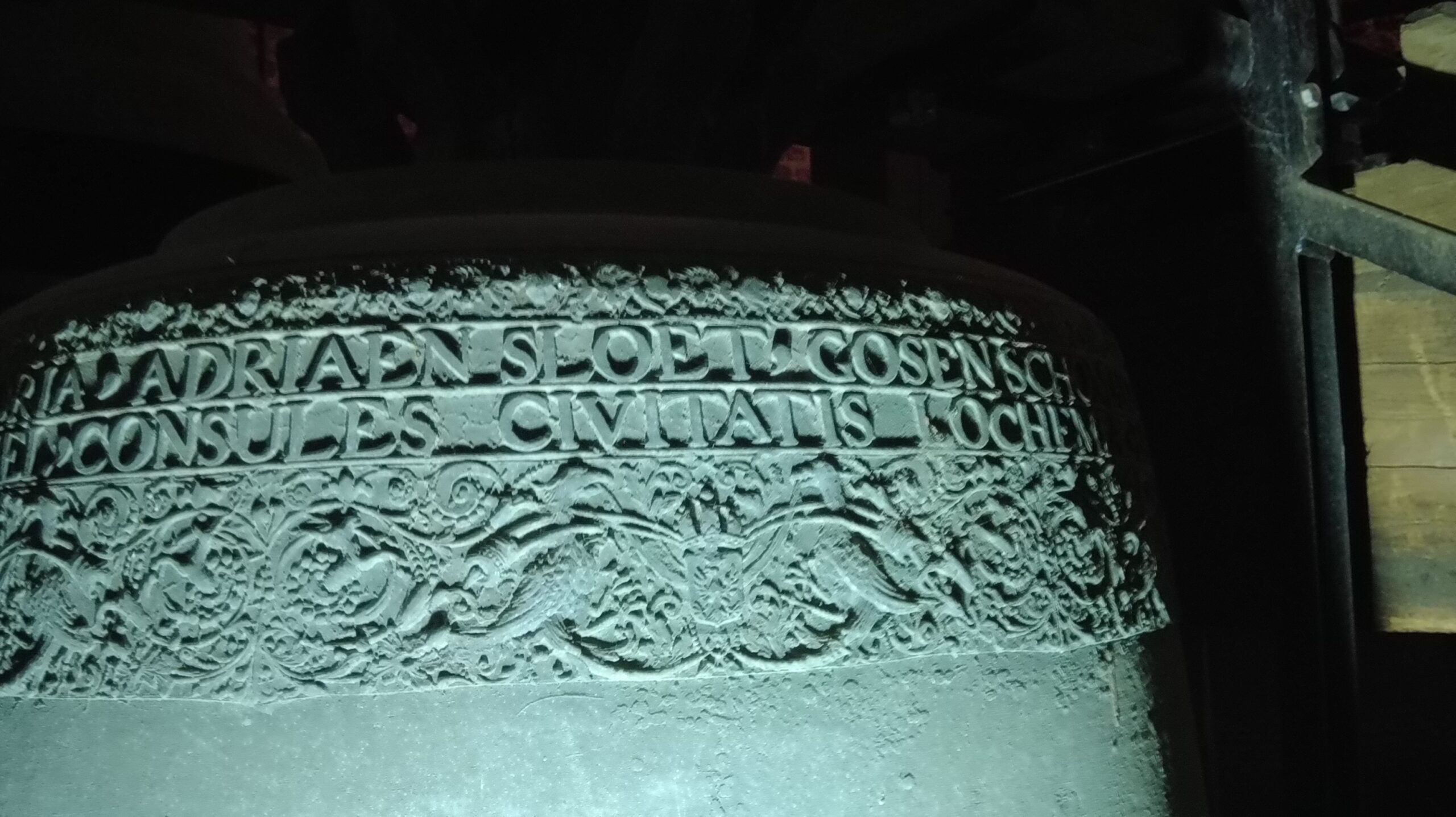 In de bovenste tekstband: Soli Deo Gloria, Adriaen Sloet, Gosen Schomaker, Bartholt Schomaker, Jan Westen Bargh, Evert Jan Beniamin Van Golstein In de onderste tekstband: Jan Te Winckel, Consules Civitatis Lochemiae, Bartholdus Schomaker Secretarius, Gerhart Schimmel Me Fecit Daventriae En op de flank: 1687