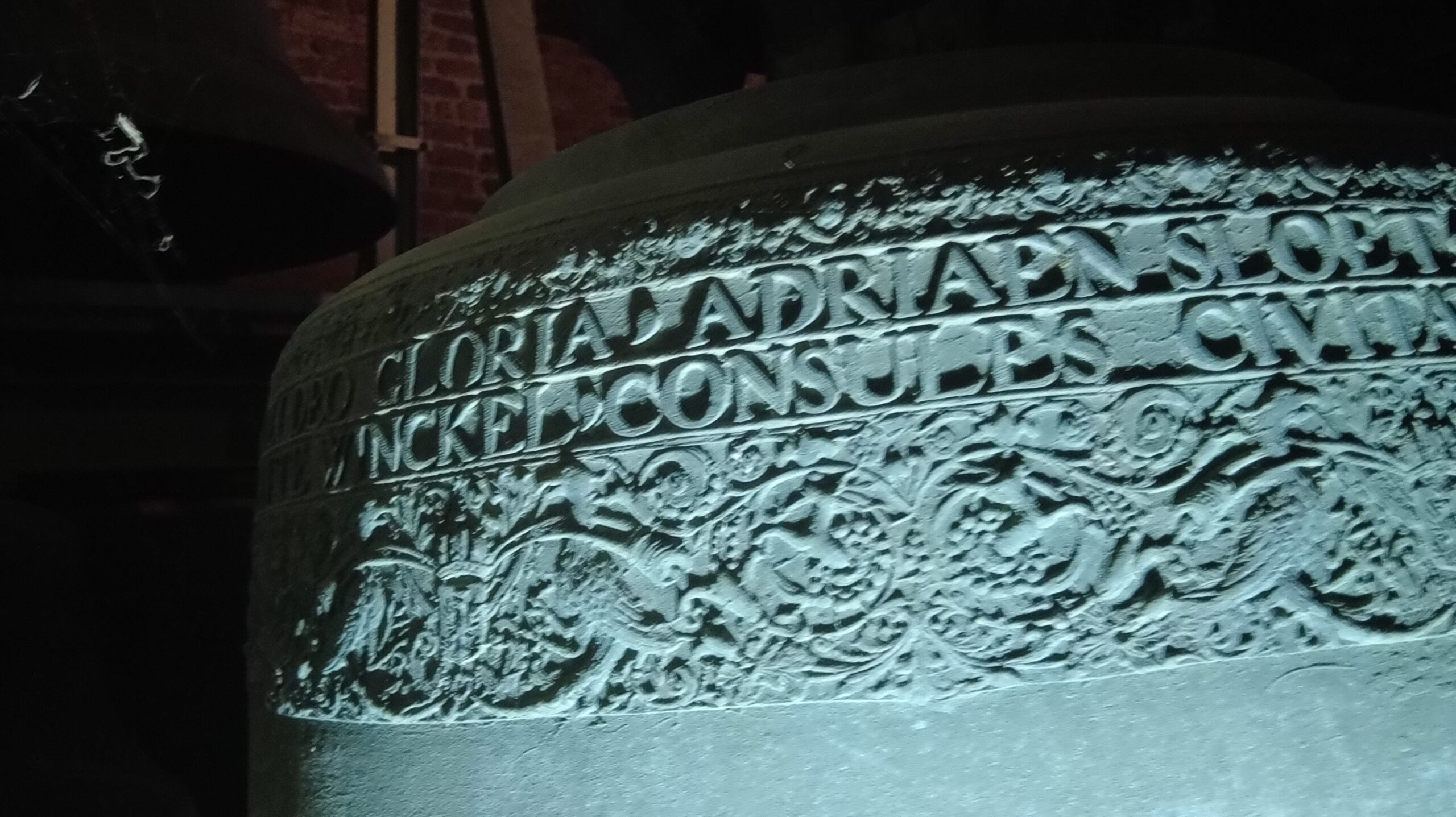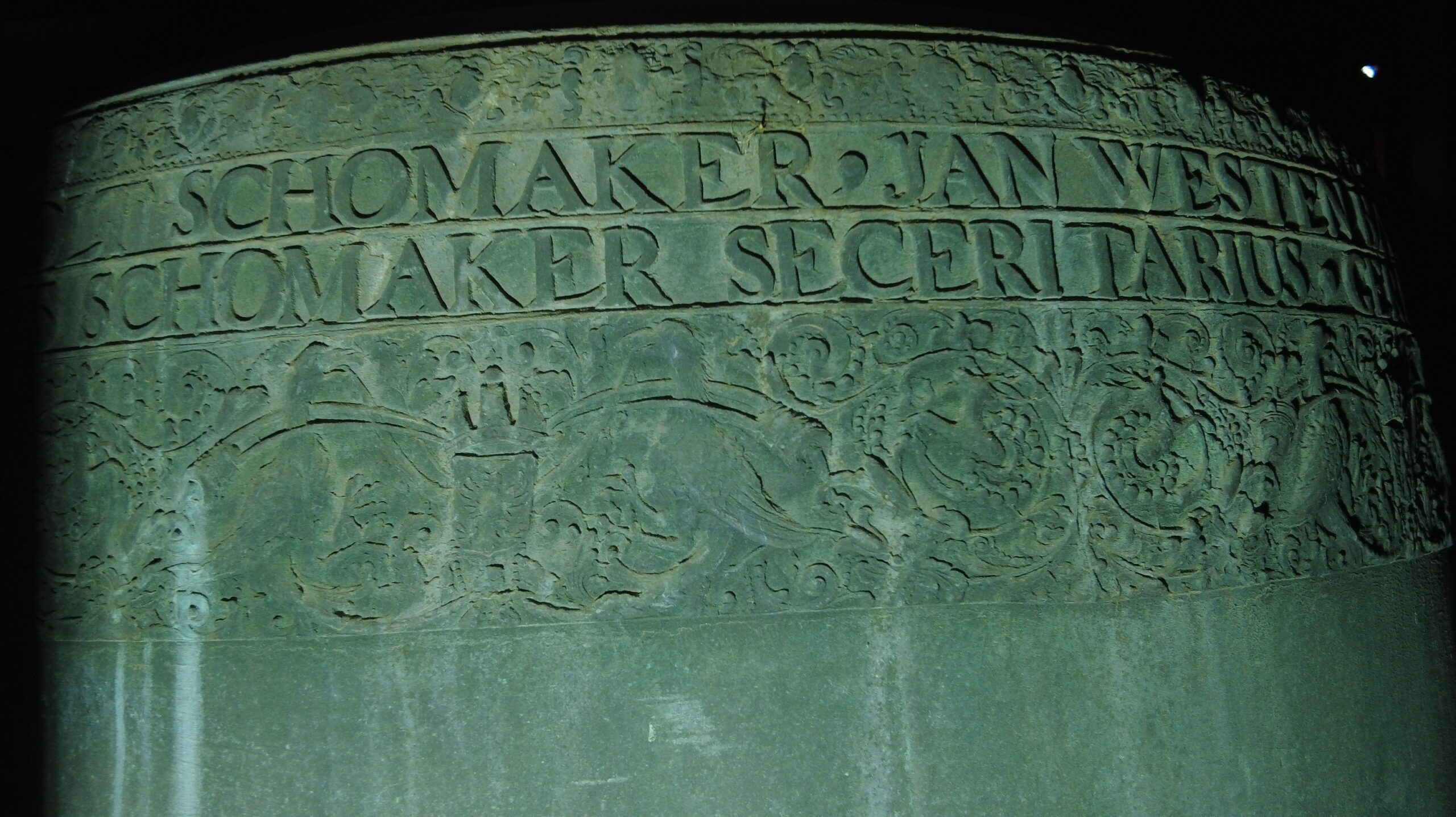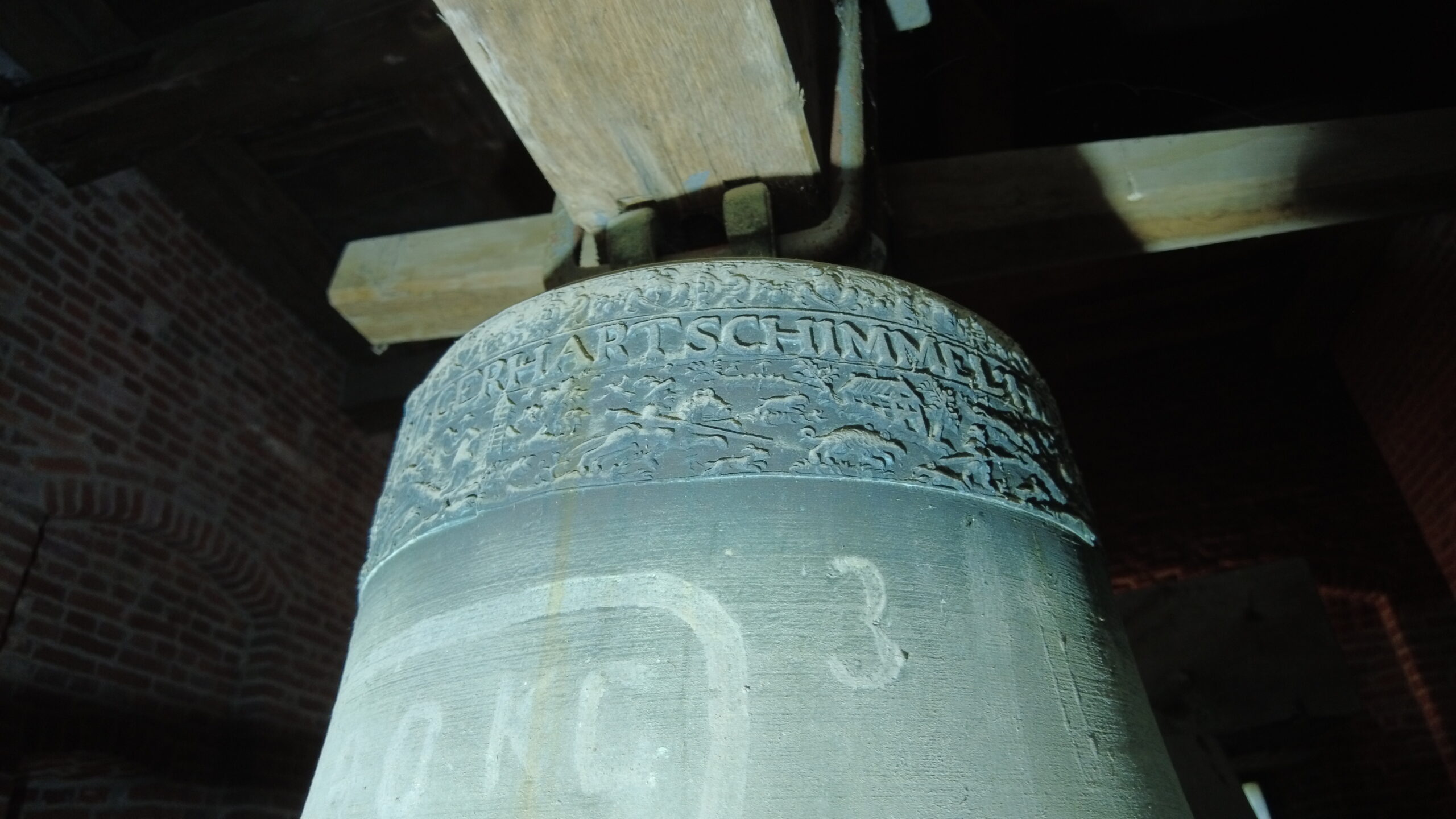 In de bovenste tekstband: Soli Deo Gloria, Adriaen Sloet, Gosen Schomaker, Bartholt Schomaker, Jan Westen Bargh, Evert Jan Beniamin Van Golstein In de onderste tekstband: Jan Te Winckel, Consules Civitatis Lochemiae, Bartholdus Schomaker Secretarius, Gerhart Schimmel Me Fecit Daventriae En op de flank: 1687